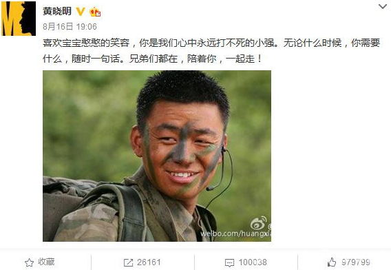 黄晓明:喜欢宝宝憨憨的笑容,你是我们心中永远打不死的小强。无论什么时候,你需要什么,随时一句话。兄弟们都在,陪着你,一起走!