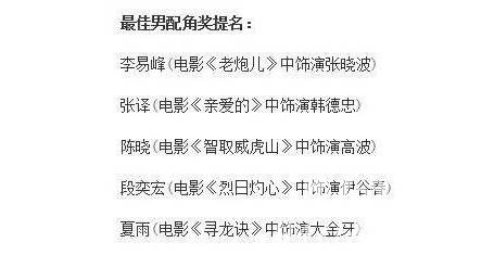 最佳男配角的提名,除了李易峰,陈晓存在感偏弱,其他三位在片中的表现都被誉为是“教科书式的演技”: