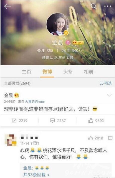 11月14日,演员金晨发微博称“理非诤而得,道非辩而存”,暗示道理并非越辩越明,而我不想与你争抢。微博一出,引来网友热议,纷纷猜测这是否与传言金晨被张天爱抢角有关。而金晨的粉丝后援会官微也留言:“君子矜而不争”力挺。