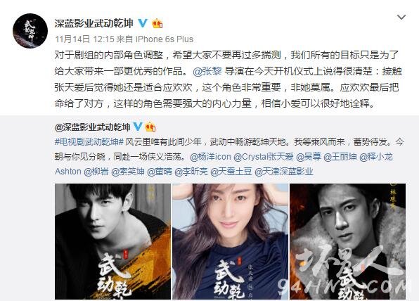 剧组也是很厉害的呢,临阵换主角。不过拍戏不比临阵换将,不是啥大忌讳。很多经典角色,都是换角后才诞生的。换角在娱乐圈很正常,可是被换下来的金晨就不爽了,不演应欢欢可以演绫清竹呀,最后啥都没捞到就out出局了。金晨在微博中发文暗讽张天爱:理非诤而得,道非辩而存,闻君好之,请罢!对比叶青的简单粗暴,金晨的微博倒是很文绉绉呢。其实用简单的话来讲,就是:老娘不想和你撕,你爱咋地咋地吧!