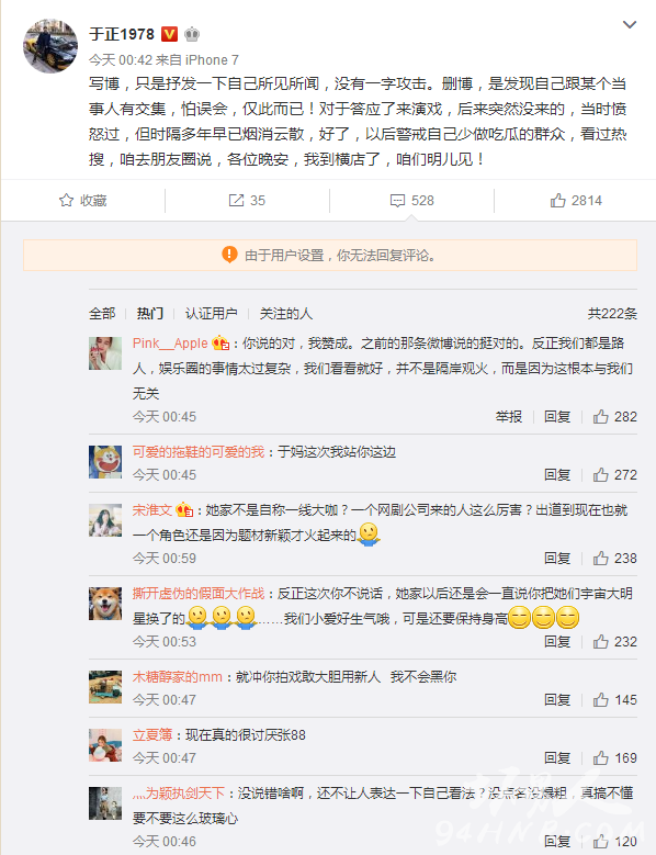 微博发出后不久,于正便将微博删除,直至17日凌晨42分,于正才在微博中解释为何写了微博又删了。“写博,只是抒发一下自己所见所闻,没有一字攻击。删博,是发现自己跟某个当事人有交集,怕误会,仅此而已!对于答应了来演戏,后来突然没来的,当时愤怒过,但时隔多年早已烟消云散,好了,以后警戒自己少做吃瓜的群众,看过热搜,咱去朋友圈说,各位晚安,我到横店了,咱们明儿见!”