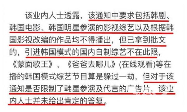 这一次的通知被业界认为是“限韩令”升级版。有业内人士解读,根据这次限韩令,凡是与韩国有关的电视、电影、综艺节目甚至广告片都一律不得播出。而且此次通知不仅针对各大卫视,同样也包含了网络平台,相当于韩国面孔全面退出各个屏幕。