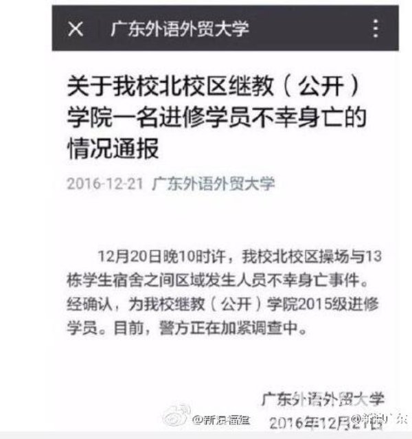 广东外语外贸大学21日凌晨发布通报称,12月20日晚10时许,我校北校区操场与13栋学生宿舍之间区域发生人员不幸身亡事件。经确认,为我校继教(公开)学院2015级进修学员。目前,警方正在加紧调查中。