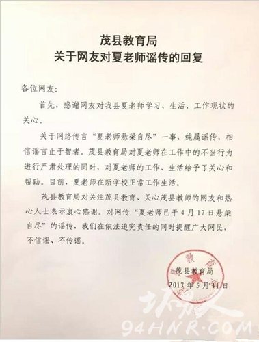 对于网传夏老师自杀一事,5月11日,茂县教育局发布声明否认夏老师自杀,称是谣言。通报如下: