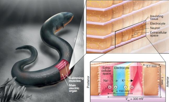电鳗是一种淡水鱼类,能通过特化的肌肉组织放电。它们的体长可达两米,而放电器官的长度就可达体长的80%。在放电器官中有数以千计的特化肌肉细胞,称为“放电体”。每个放电体只能产生很小的电压,但数千个放电体合在一起,就能产生高达600伏的电压,足以击倒一个人,甚至一匹马。电鳗的放电机制为伏打提供了发明电池的灵感,使他称为一位19世纪的名人。