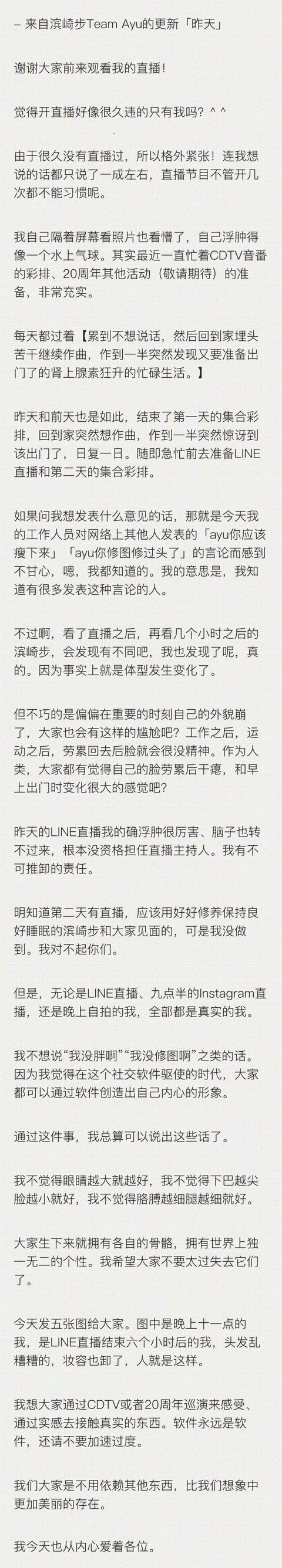 正当被众人惊呼天后变肿时,滨崎步透过社群网站晒自拍照,轻抬45度角侧脸入镜,又变成尖尖的V字脸蛋,照片反差引起网友议论。她后来发文向粉丝说明,当天是因为太累所以浮肿,“我自己看画面也觉得肿得像气球”、“又要说小步照片修太多了”,最后强调会好好休息、睡觉,并向大家致歉。