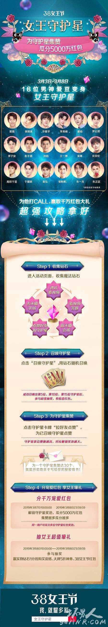 现在的商家总是喜欢搞各种的噱头,马上就是三八妇女节了,作为销售行业的引领者天猫又是怎么促销的呢?有什么优惠吗?许多人看到优惠,觉得不占便宜真的是太不划算了,所以经常去抢这些红包,那么要怎么样才能抢到呢?所以她们就买买买!今年女王节天猫号召了18位男神爱豆变身守护星,从3月3日到3月8日,只要天猫用户收集点赞就有机会瓜分5000万红包福利。