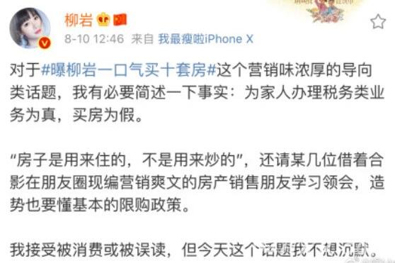 近日,网友#曝柳岩一口气买十套房#对此,10日,她发微博回应,表示只是为家人办理税务业务,买房为假消息。