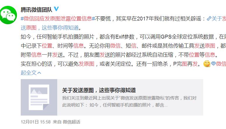 说到微信,现在它已经成为了人们的通讯工具,但随着它是需要手机注册的,而且是实名制的,有网友称自己在发送原图的时候,很可能会泄露位置信息等,前段时间微信一直没有回应,而终于在昨日发表声明称,这是谣言,并且早在2017年的时候就进行了辟谣!