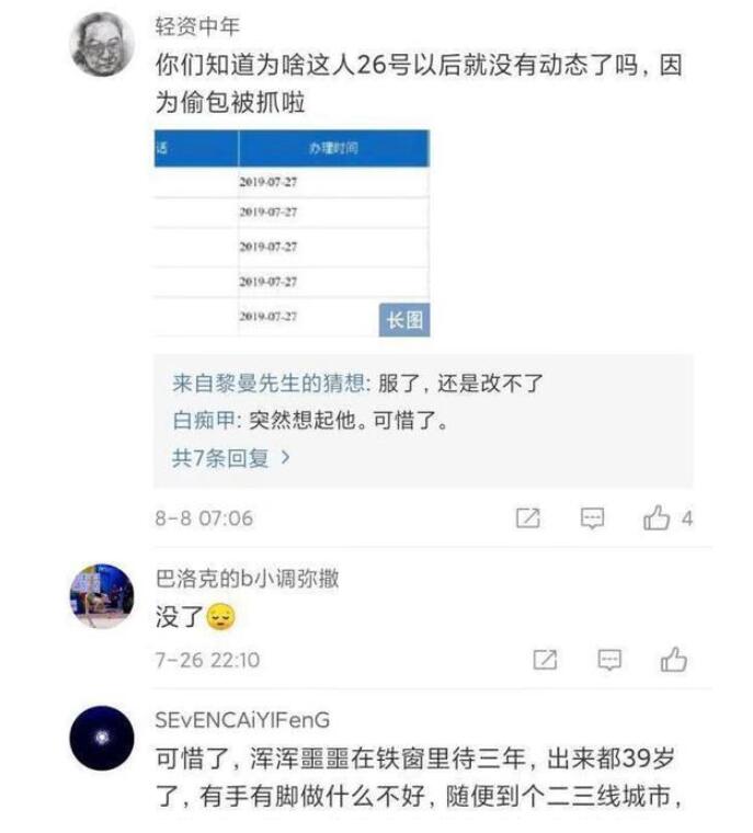 在回复中,这位网友透露自己损失了3万多元的财物,并且表示:“你们知道这人26号以后就没有动态了吗?因为偷包被抓了。”而翻看张尚武微博,在7月26日之后,确实没有了动态。