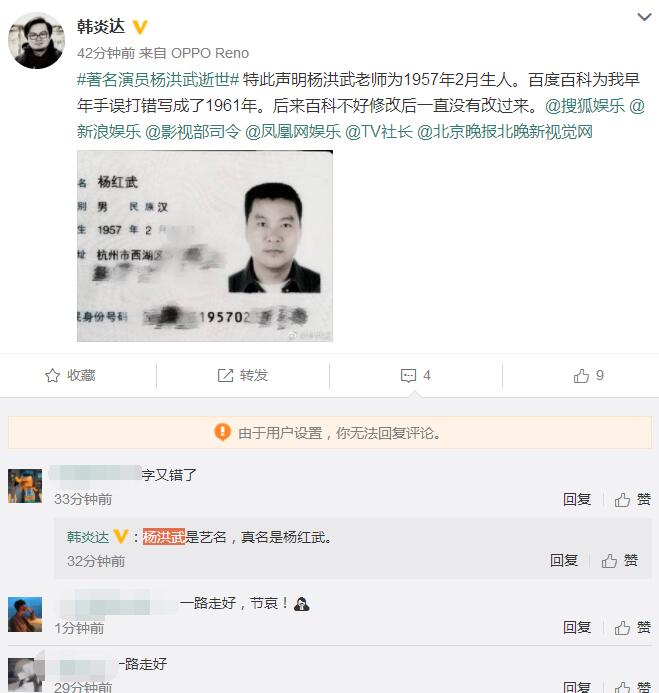 之后在微博上发文称年龄搞错了,还曝出了老师的真名!特此声明杨洪武老师为1957年2月生人。百度百科为我早年手误打错写成了1961年。后来百科不好修改后一直没有改过来!要求各大媒体将年龄改过来!