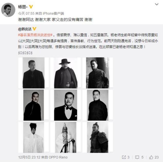 韩炎达发文称:倍感震惊、难以置信,如五雷轰顶。杨老师生前年轻辈中待我恩重如山[大哭][大哭][大哭]️每遇多有提携,言传身教、行为世范。前两天刚刚通完话,没想今日却成永别!以后再难为您拍照、修图与您秉烛长谈指点迷津。在此顿首已谢杨老师知遇之恩!