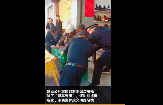 12月16日,福建泉州,一家商铺门口被城管执法员摆上数百公斤重的钢筋水泥垃圾桶。被放垃圾桶的商铺是南安城市管理局和环卫处等多部门工作人员经过长期观察选定的!这些店主不能自觉做好门前三包,门口干净无垃圾有的店主离最近的垃圾桶仅有几步之遥,也不能自觉清理垃圾。城管执法人员表示,如果店家能自觉,将撤回“专属垃圾桶”。