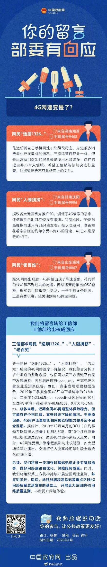 对此,工信部权威回应称,关于网民反映的 4G 网络速率下降情况,我们综合分析了多个渠道的检测数据,包括国内第三方测速平台宽带发展联盟、国际测速机构 speedtest、三家电信运营企业检测系统等。
