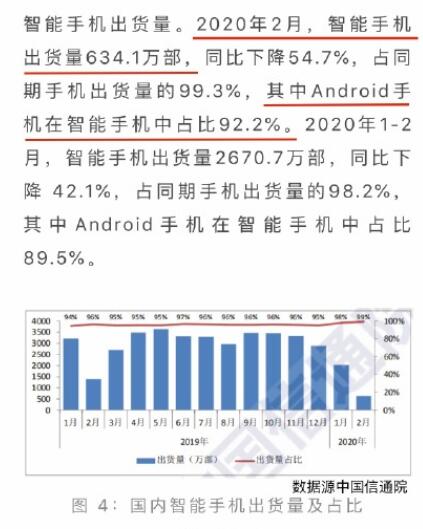 中国信通院的数据显示,2020年2月,国内手机市场总体出货量638.4万部,同比下降56.0%。