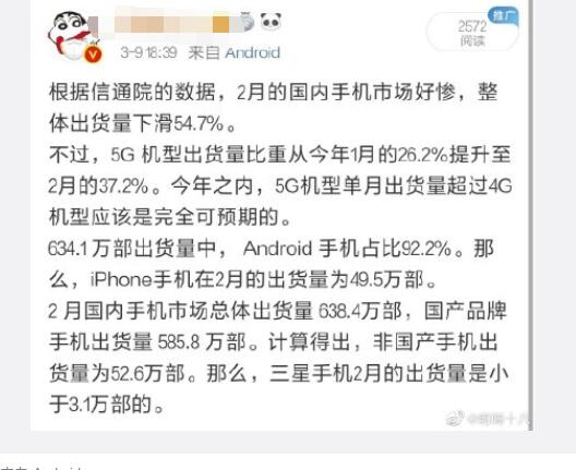 但还是有网友提出了质疑称个人对这个数据充满了质疑,仅49万部?据说某东自营iPhone全系列销量都不只40万了,看了下这个结论是基于中国信通院2月国内手机市场出货量数据得来的:2月中国智能手机市场出货量634.1万×7.8%(非Android占比)≈49万台。