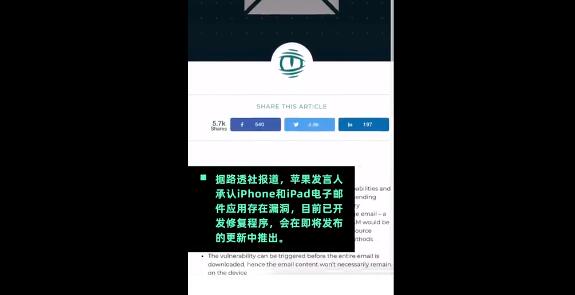 苹果移动操作系统的一个缺陷可能导致数百万iPhone和iPad用户容易受到黑客攻击。移动安全公司ZecOps发布的研究报告称,苹果邮件应用程序中的一个漏洞使设备容易受到复杂的攻击。