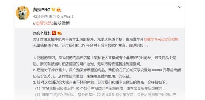 昨晚,罗永浩在抖音平台直播带货,在半价车抢购过程中出现意外情况,官方今日发布致歉说明。据悉,问题原因是商品在店铺上架和进入直播间有个非常短的时间差,导致商品上架后,瞬间就被当时在店铺里的用户抢光,无法把购物链接挂到直播间。