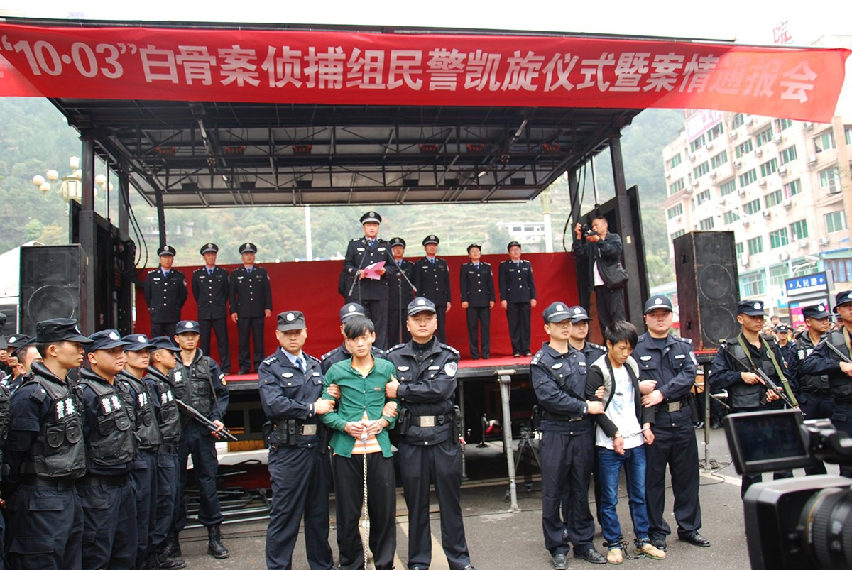 10月27日,贵州桐梓警方在街头召开案件通报会,通报“白骨案”两名犯罪嫌疑人杨何建、杨善辉被抓获。2012年11月2日晚,杨何建与其妻子曾某因各种矛盾积怨爆发,逼其说出银行卡密码后将其杀害,并用斧头、菜刀进行分尸,将曾某的头、手宰下,用塑料薄膜裹好,装在一个蛇皮口袋内,之后,将躯干的肌肉剔除,继而将有人体明显标志的肢体部位倒入自己家中的粪坑,其余部位合装在另一个蛇皮口袋内,之后装有头颅的口袋抛到距自己家200米远的高速路排水沟内。