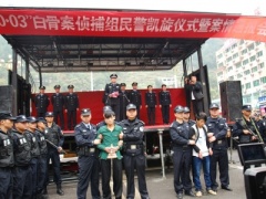 2012年11月2日晚,杨何建与其妻子曾某因各种矛盾积怨爆发,逼其说出银行卡密码后将其杀害,并用斧头、菜刀进行分尸,将曾某的头、手宰下,用塑料薄膜裹好,装在一个蛇皮口袋内,图为10月27日,贵州省遵义市桐梓县警方在县城火车站广场公开通报“白骨案”,嫌疑人杨某被警方成功抓获。