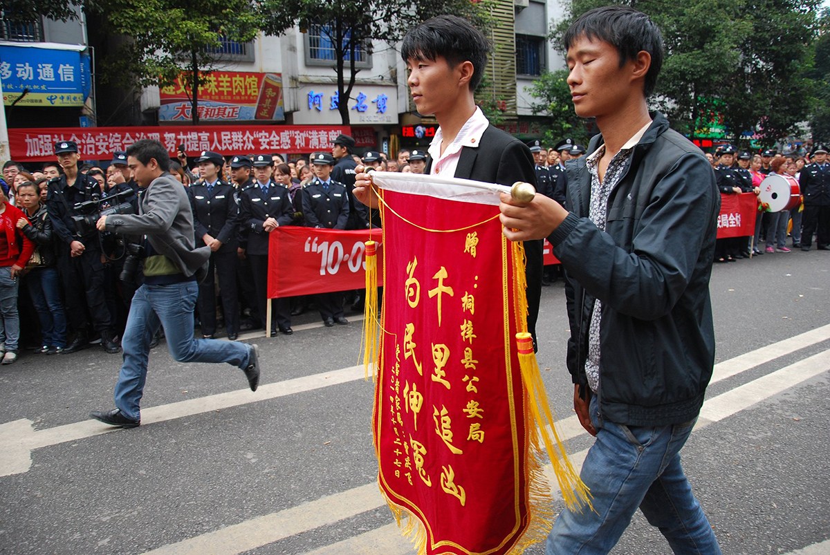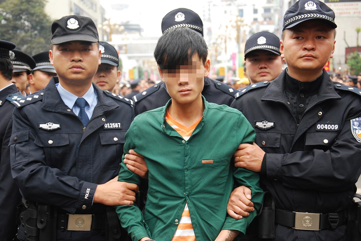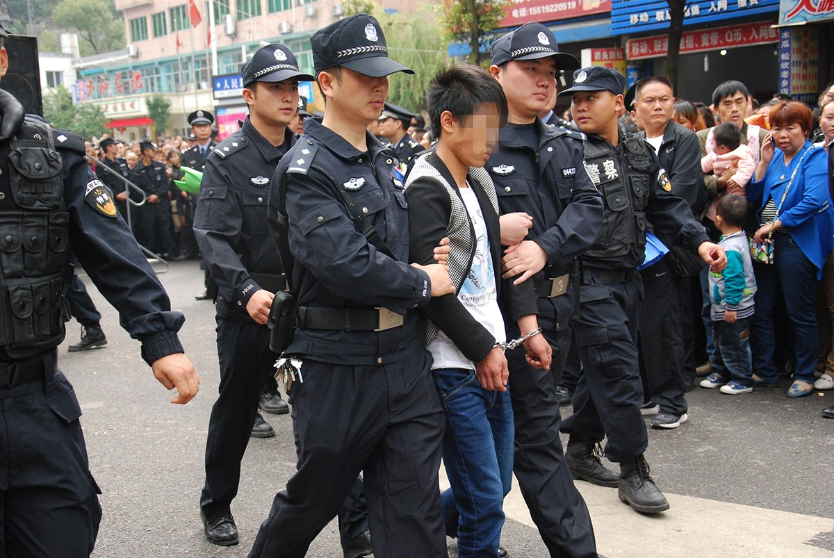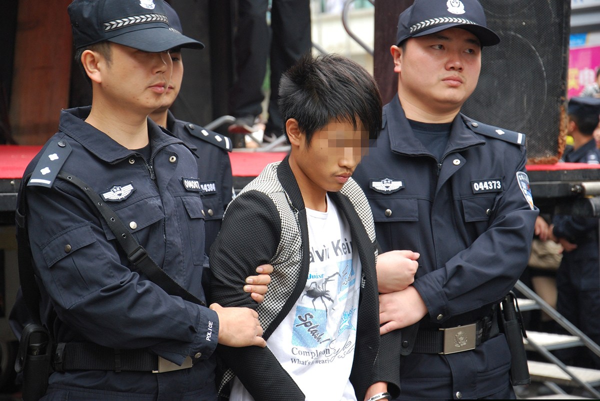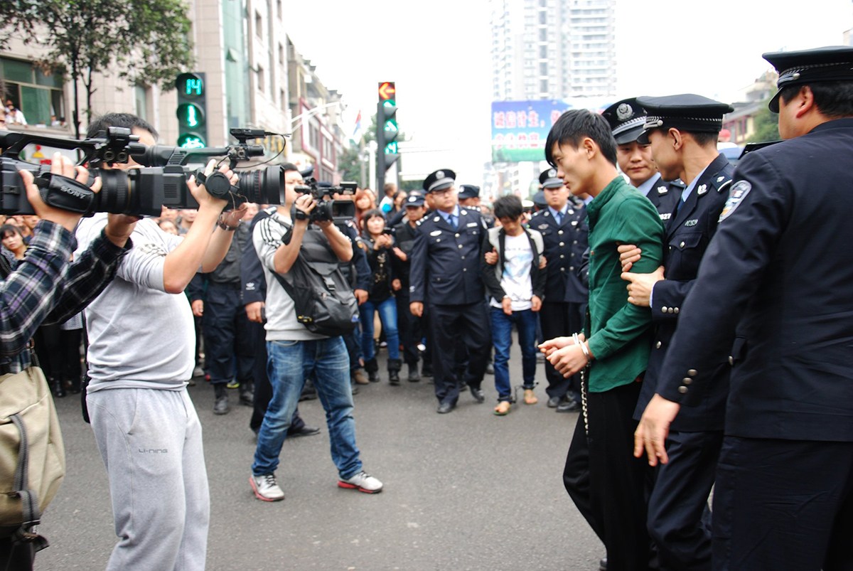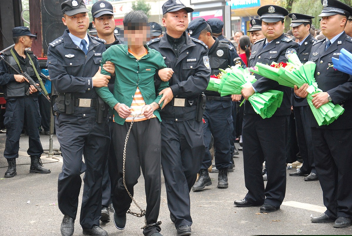 10月27日,贵州省遵义市桐梓县警方在县城火车站广场公开通报“白骨案”,犯罪嫌疑人杨何建被警方押送到现场。