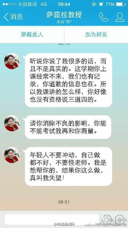 昨日晚,涉事教师在电话中拒绝了新京报记者的采访。对于此事,她在其实名认证的微博中称,曝光者为一个经常不来上课的李姓男生,称其“没有资格说三道四”,“不能代表大家”,自己课上的怎么样,“希望学校来查查”。
