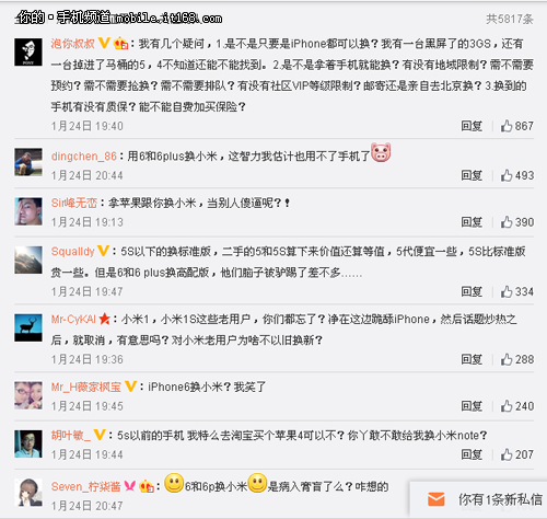本月24日,小米网新媒体总监钟雨飞也在其微博上发起推广活动称想搞个以旧换新的活动,并拟定活动规则,即5s及以前的手机,不管好坏,免费换小米Note标准版;6及plus换顶配版!”。不过,钟雨飞提出这个以旧换新的活动,网友并不买账。从评论上看,网友们普遍认为标准版的更换方案还是有一定的可能性,但用iPhone6或plus更换小米Note顶配则实在是可行性不高。