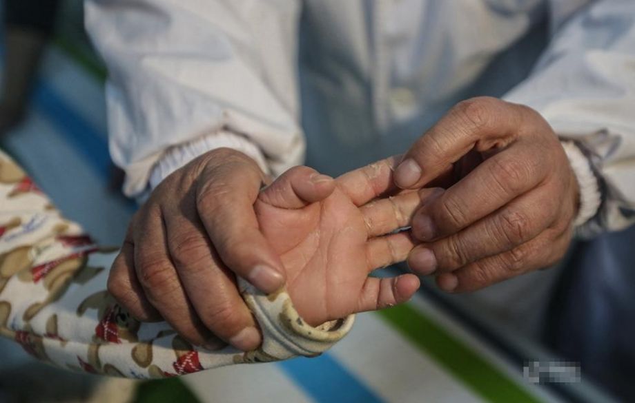由于长时间使用手代替脚,孩子的手心全是茧,而且臂力惊人。