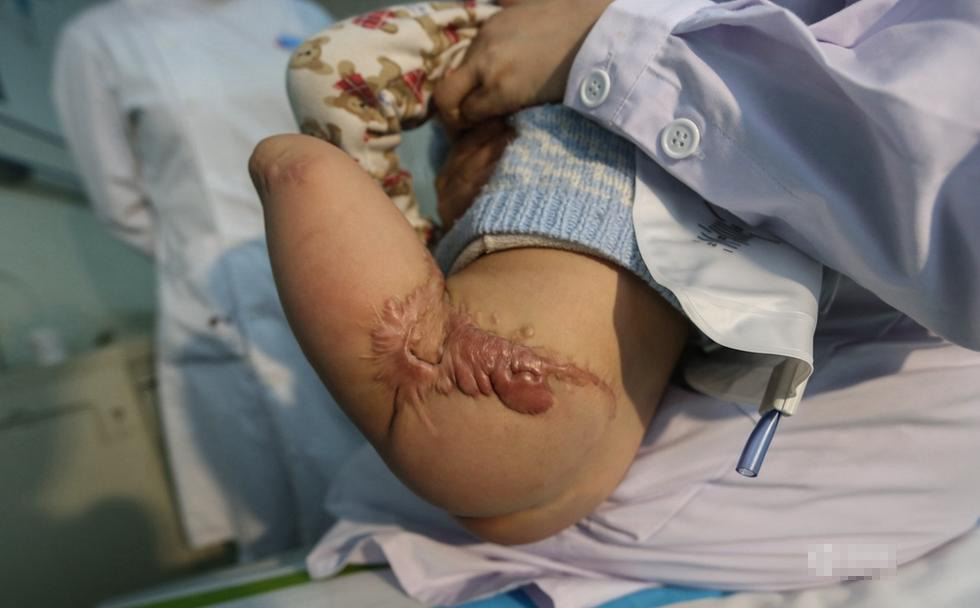 疤痕体质给小峰带来了无尽痛苦,目前外伤已经愈合,但留下了巨大疤痕。同时尿道内部也不断堵塞,这种斗争可能会持续十几年甚至几十年。也因为尿道堵塞,孩子不可能安装假肢。