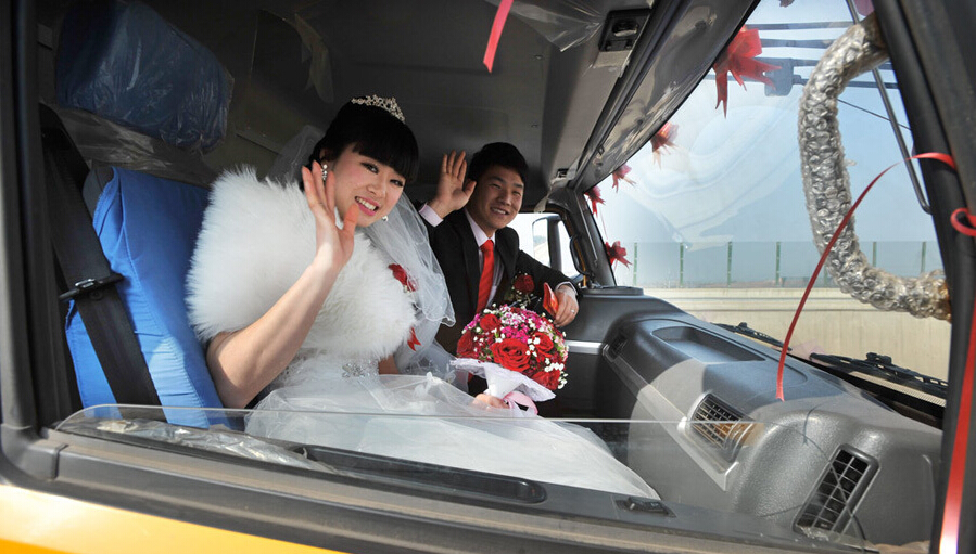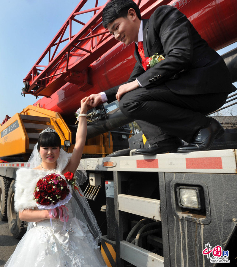 4辆50吨吊车,加上2辆25吨吊车,组成6辆吊车的车队,寓意“六六大顺”。25岁的新郎告诉记者,因为平时工作在吊车上,所以他想用这种特殊的方式,来迎娶最爱的人。他表示,尽管宝马、奔驰价值不菲,相比之下,他们的吊车一点都不掉价,以50吨吊车为例,一辆价值都在160万以上。