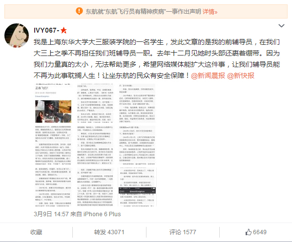 @IVY067-:我是上海东华大学大三服装学院的一名学生,发此文章的是我的前辅导员,在我们大三上之季不再担任我们班辅导员一职。去年十二月见她时头部还裹着绷带。因为我们力量真的太小,无法帮助更多,希望网络媒体能扩大这件事,让我们辅导员能不再为此事耽搁人生!让坐东航的民众有安全保障!