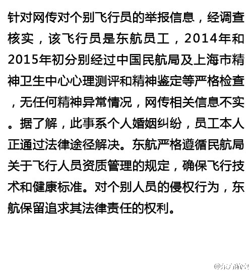Emma想吃瘦:请拿出证据来证明这真的是虚构。原本我一家准备在4月出国游玩,买的就是东航的机票。现在出现这种事情,你却只是发个避谣微博,这让我们如何放心去乘坐你们的飞机。难道还要我坐飞机前去询问你们机长是不是有精神疾病?