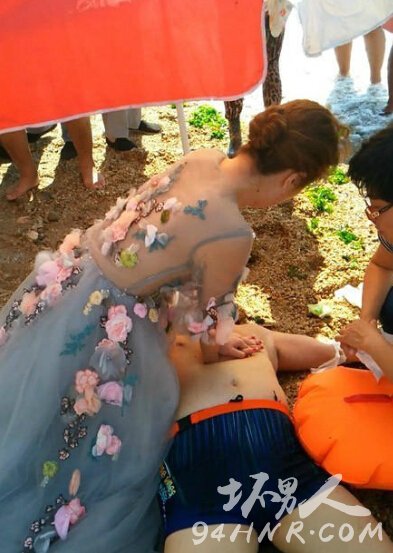 9月21日上午,在大连石槽一海水浴场,一名男子在游泳时突发心脏病不幸溺水,被救上岸时已没有呼吸心跳,在附近拍婚纱照的一位新娘见状,跪地抢救这位陌生男子20多分钟。