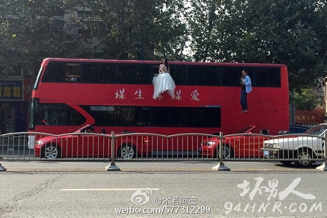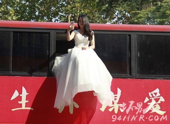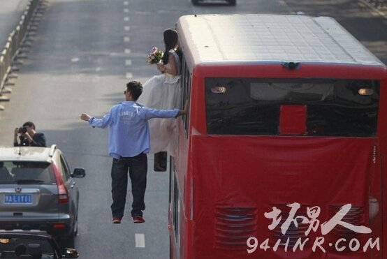 ¶ø¹«½»³µµÄǰ²à£¬ÐÂÄïÉí´©½à°×»éÉ´£¬×øÔÚ´Ó¹«½»³µÖÐÉì³öµÄÒÎ×Ó£¬²»Í£µÃÏòÅÄÕÕÈËȺ»ÓÊÖʾÒâ¡£¶øÓ빫½»³µÐγÉÏÊÃ÷¶Ô±ÈµÄ£¬ÕýÊǹ«½»³µÖÜΧ“±£¼Ý»¤º½”µÄ°ÙÍòºÀ³µ¡£