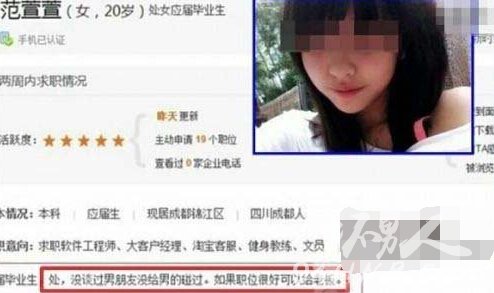 58同城求职里爆出猛料,自称范萱萱,来自成都的女毕业生求职简历称自己是处女,职位合适的话可以给老板。