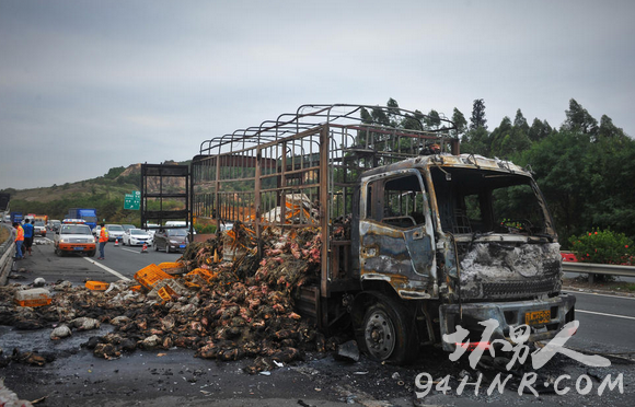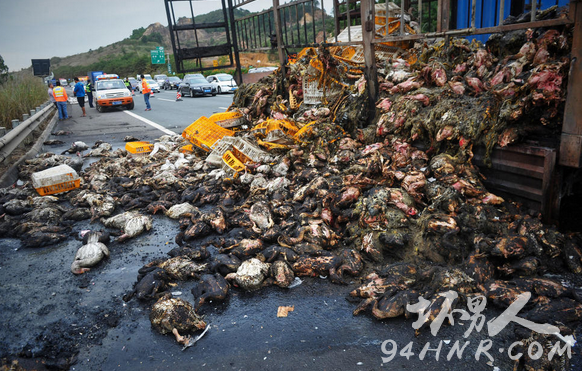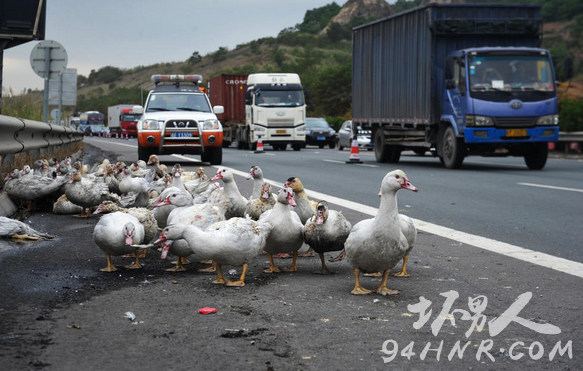 2015年11月25日,广东佛山,广明高速路一辆满载活禽鸭的货车在途中突发自燃,车上2000多只活鸭变“烤鸭”,存活下来的仅剩几十只,现场一片狼藉,惨不忍睹。