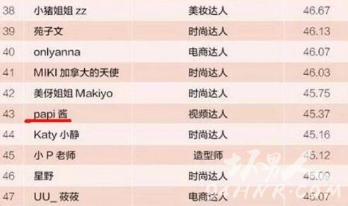 网红众多,Papi酱拍第几呢?有好奇人士统计出了一个数据,2016中国网红权力榜中,Papi酱排在第43位,排名靠前的人多为模特和时尚达人,她们的职业多和时尚相关,其中排名第二的是陈赫前妻许婧。而过去十年网红排名中,Papi酱力挽狂澜,排名第九,关注度比那些混时尚圈的达人们高出许多,自成一派的Papi酱似乎从未缺少话题性。