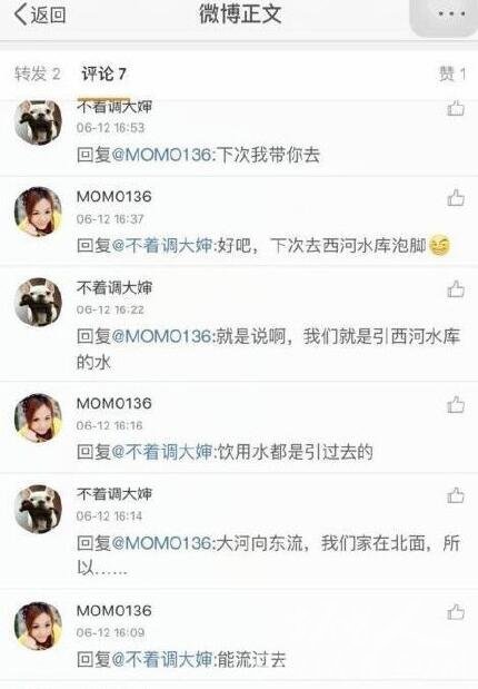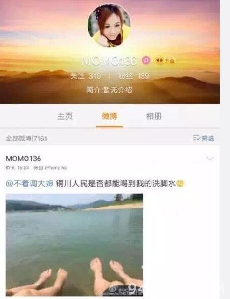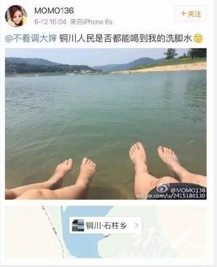 6月12日下午16点04分,新浪微博名为MOMO136的用户发布一条图文微博。照片上四条腿放在水里,并配文称“铜川人民是否都能喝到我的洗脚水”,同时@不着调大婶,并互相调侃称还要准备再找一个水库继续泡脚。