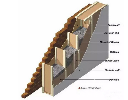 墙体从外向内依次为:红砖维护体系+防水层+保温层+结构板材OSB+内墙石膏板+装饰性材料。