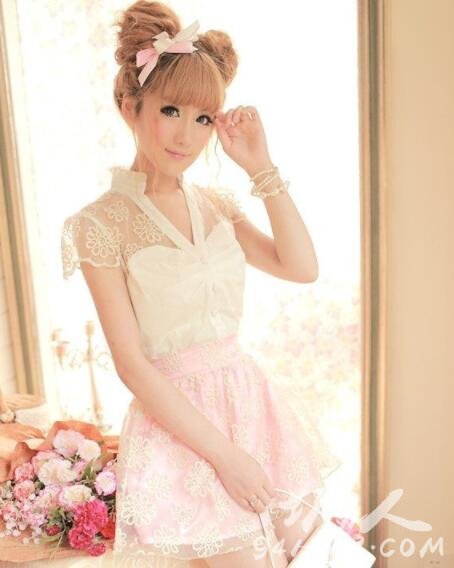 很韩味、时尚网纱拼接、气质修身型、泡泡袖。