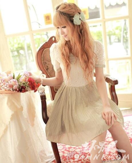 甜美蕾丝圆领泡泡袖拼雪纺连衣裙好唯美的款
