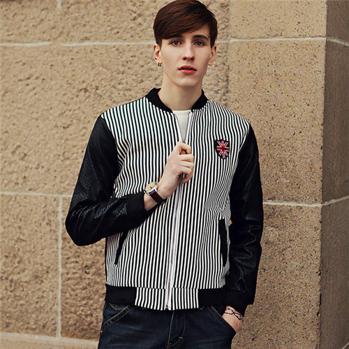 非常适合矮个子男生的竖条纹棒球领夹克外套,百搭时尚的黑白条纹,既有显高效果,对于矮胖男生还有显瘦效果。内搭白色长袖T恤or卫衣,更显清新格调。下装选配深色牛仔裤和黑色英伦短靴,当然短靴还可以换成英伦休闲皮鞋或者反绒休闲皮鞋都不错。矮个子男生想要穿出显腿长的效果来,最好还是不要裤脚挽边。