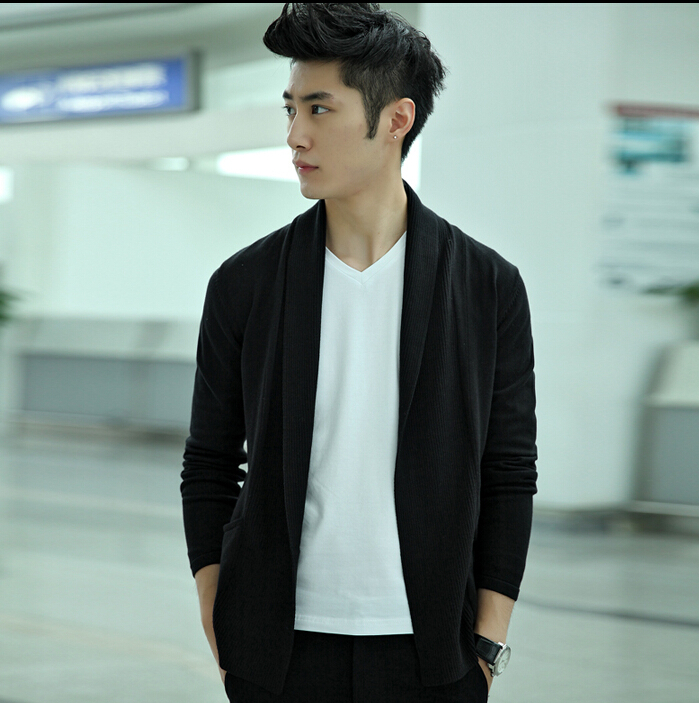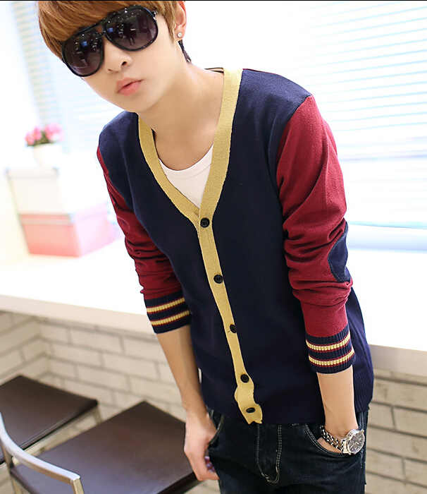 2015春秋装男针织衫英伦学院复古潮青少年修身薄开衫男士毛衣外套,穿起来很帅气,款式也是非常的新潮,这个样款非常时候瘦小的男生穿。
