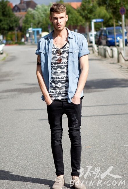 夏天,就应该这样搭配,帅气又自然。内里的T恤,有着异国风情,图案很特别,但是颜色并不会太花俏,因此适合男生们穿着。外面穿上百搭的神器牛仔衬衫作为外套,休闲范十足。