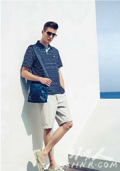 深蓝色条纹翻领短袖衬衫成熟稳重,绝对是熟男们夏日必备单品,下身搭配白色的短裤配色柔和好看,脚踩米色休闲鞋,鞋子与裤子近似的色彩搭配,修饰出迷人大长腿。