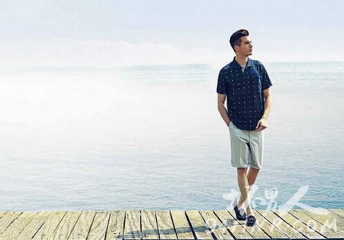 深蓝色波点图案的短袖衬衫,给人夜空的寂寥感和空间感,展现出男性独特的时尚魅力,温柔又帅气,下身搭配白色卷边五分短裤,搭配充满夏日度假风情,显得阳光随性。