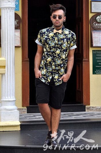 上身衬衫为短袖款式,花色多变的混搭色彩,加入蝴蝶结元素,呈现出多元素气质,下身搭配纯黑短裤,鞋子的搭配也是亮色尖嘴成熟款皮鞋,上身多样色彩,而下身低调元素,呈现出套装的上下双重感觉搭配风格。