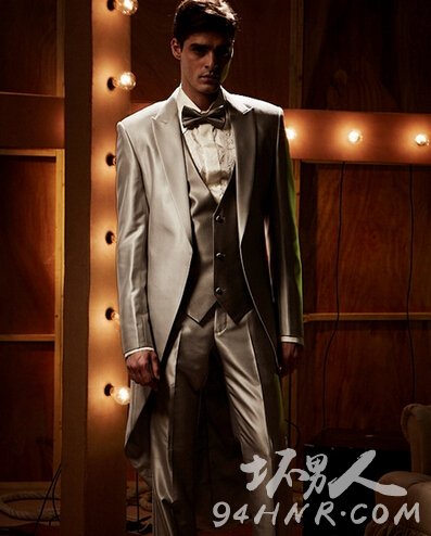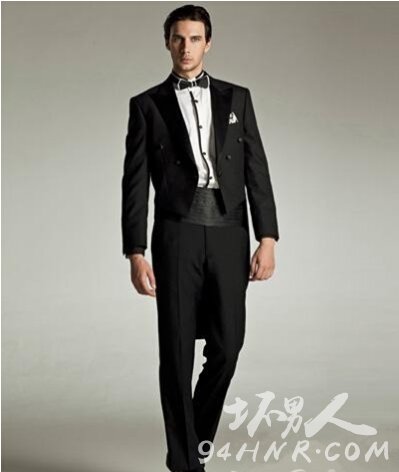 黑色燕尾服西装外套上短下长的设计,修饰出男士们的双腿更加修长迷人,打造出男模般的黄金身材比例,黑色蝴蝶结的装饰使得整体造型更具贵气。