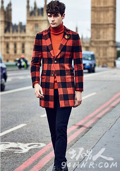 橘红色和黑色的格子搭配非常的亮眼,别致的修身复古版型,让时尚更为经典,下身穿深蓝修身裤与高帮系带皮鞋,秋冬这样的装扮让你成为街头的亮点!