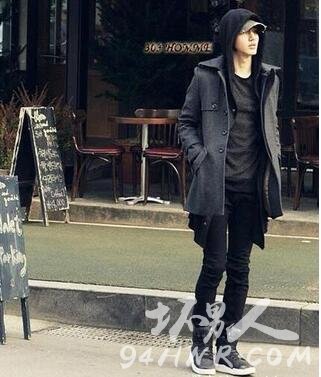 此款黑色中长毛呢风衣搭配了黑色短筒帆布鞋,呼应了风衣的颜色,白色鞋带给人一种醒目的感觉,整体搭配起来色调一致,给人一种简约又带有街头时尚感。